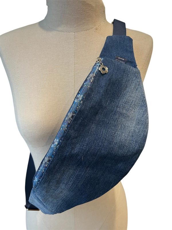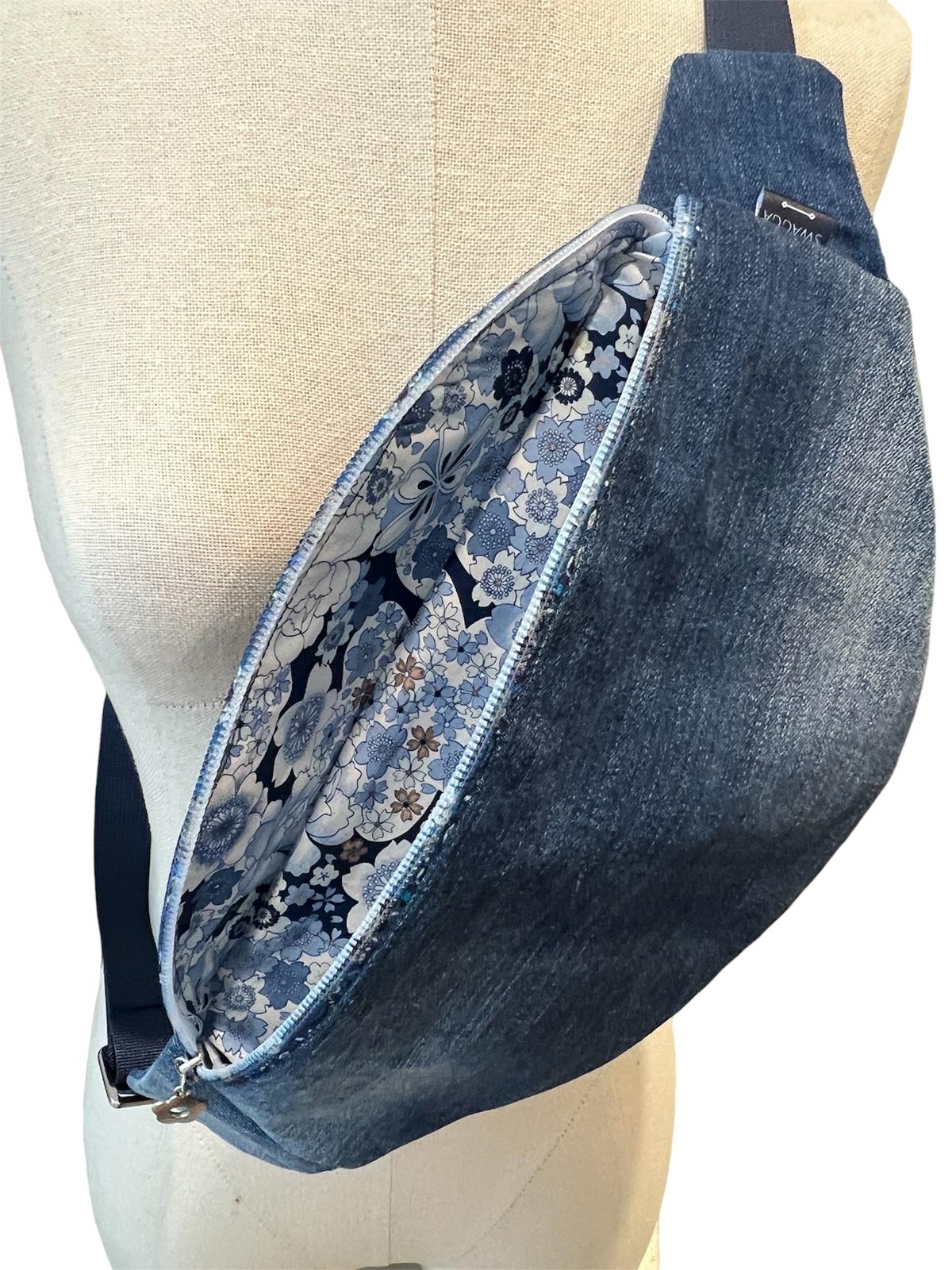 This blue denim bum bag features:
