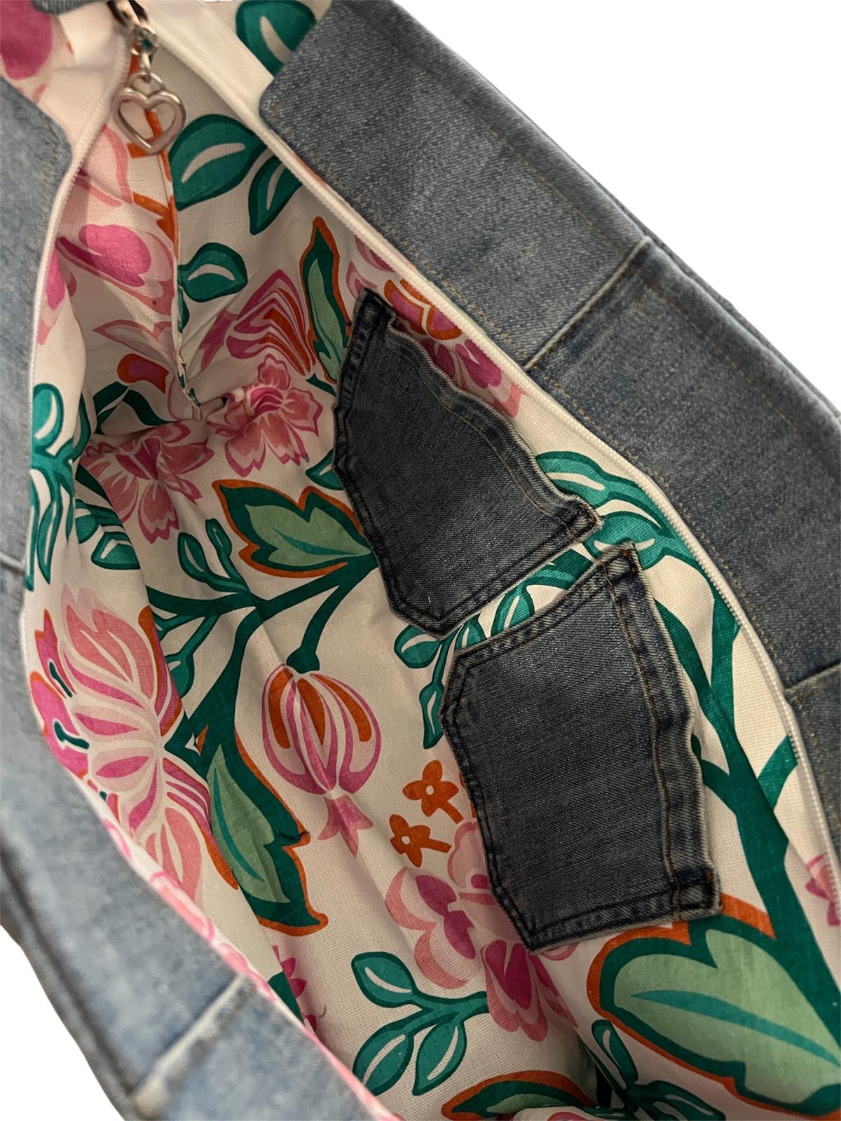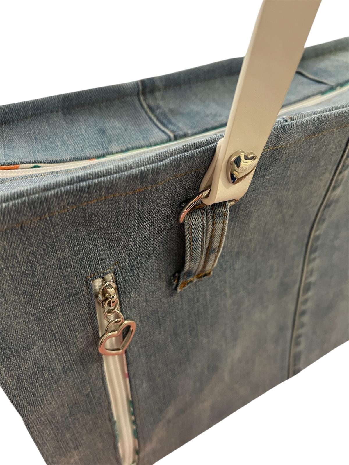 This denim handbag features: