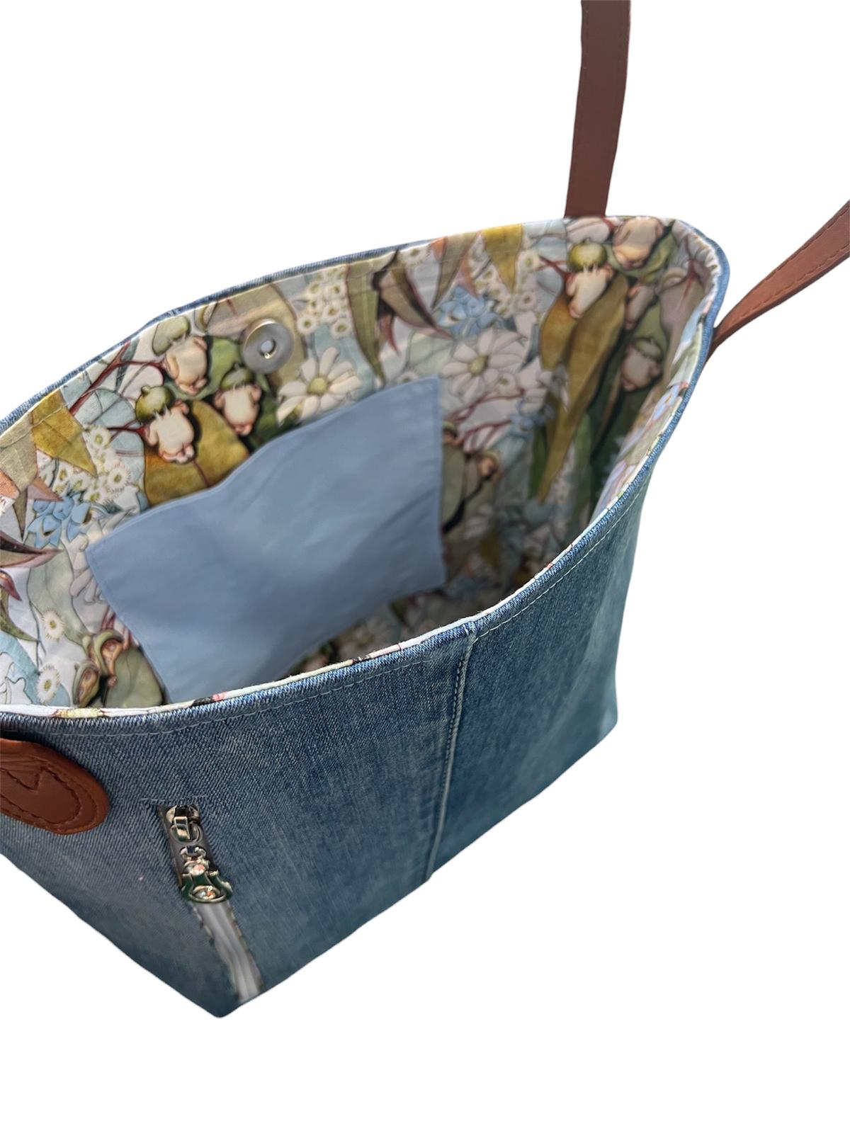Upcycled blue denim jeans that has been transformed into a fashionable handbag detailed with May Gibbs’ SnugglePot & CuddlePie characters.
