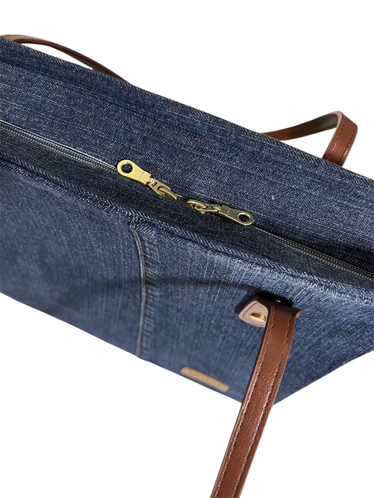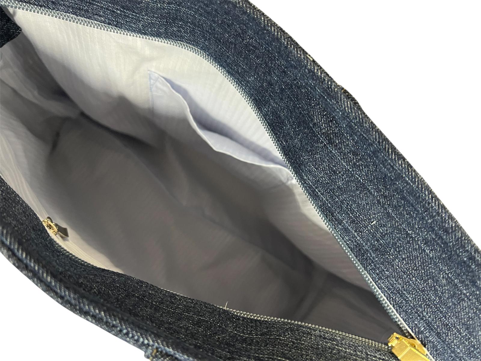 - Pinstriped print lining the interiorupcycled from a business shirt.