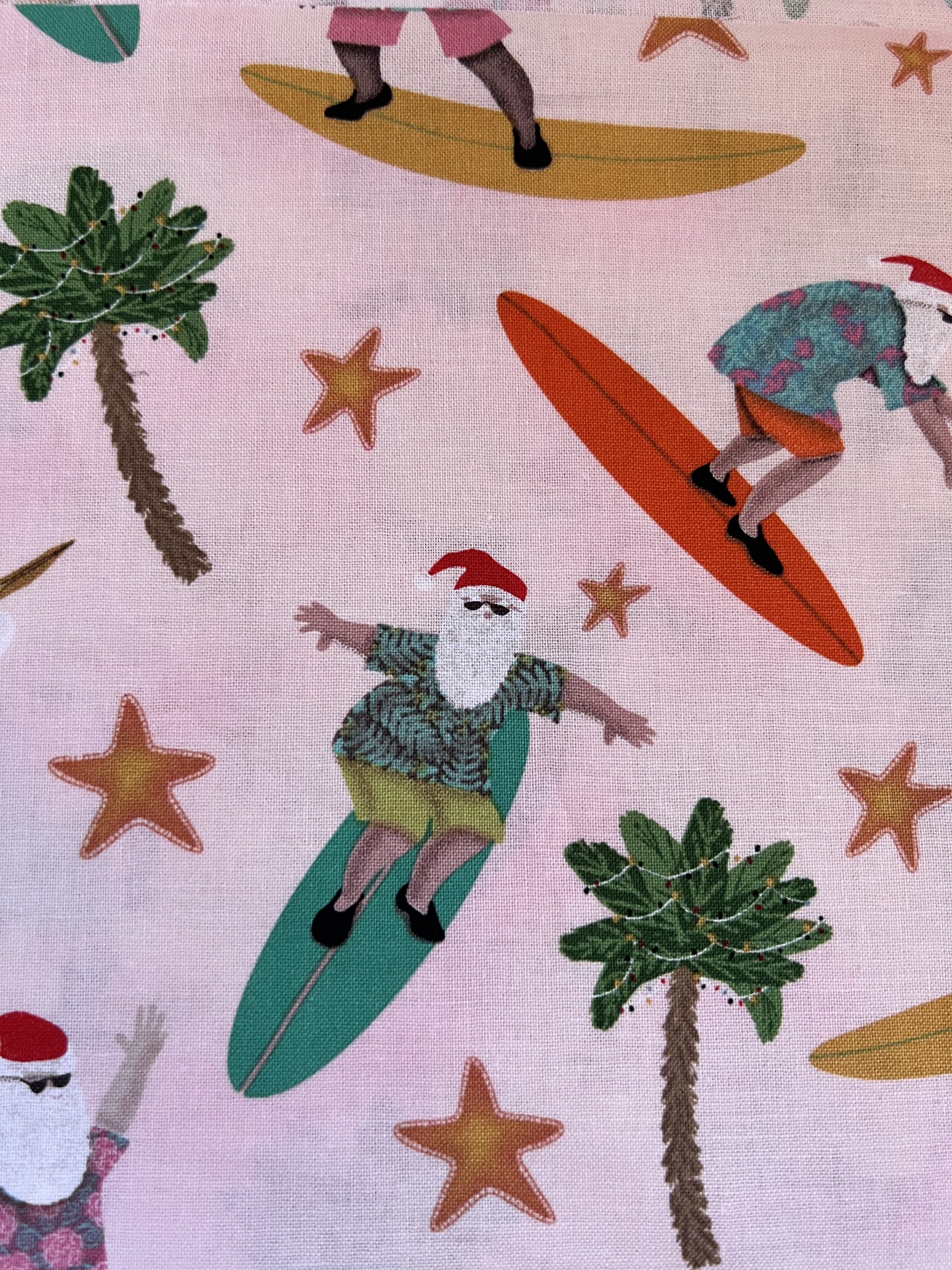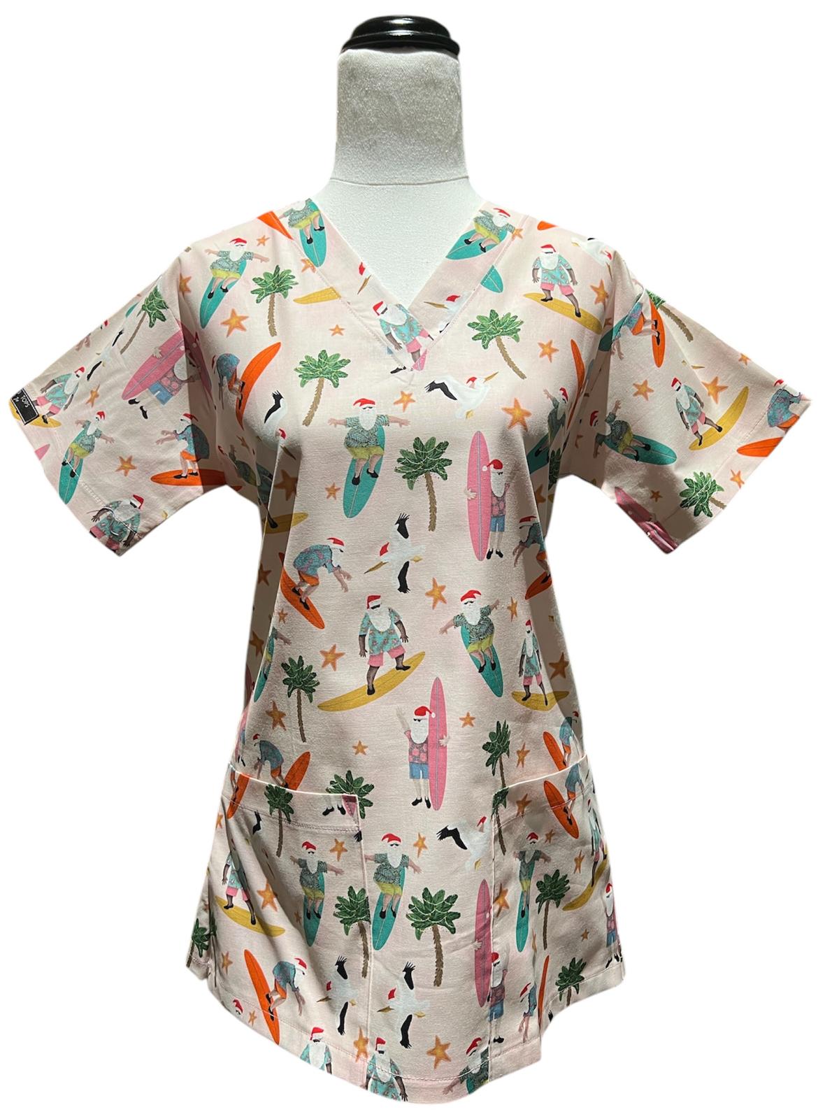 Aussie themed Christmas scrubtop featuring Santa surfing in Pink