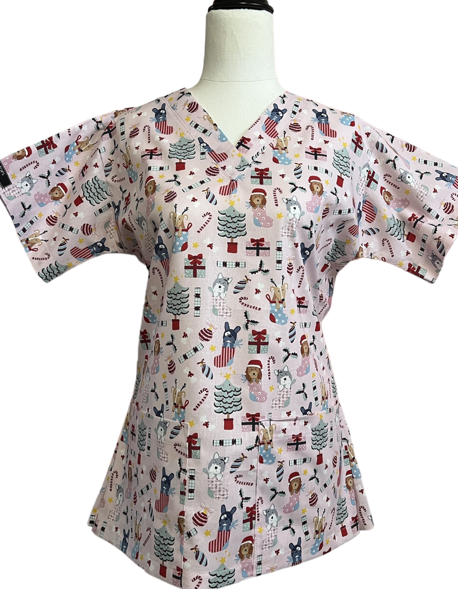This cute pink Christmas scrubtop features a range of dogs in a Christmas stockings and various Christmas items. The perfect Christmas scrubtop
