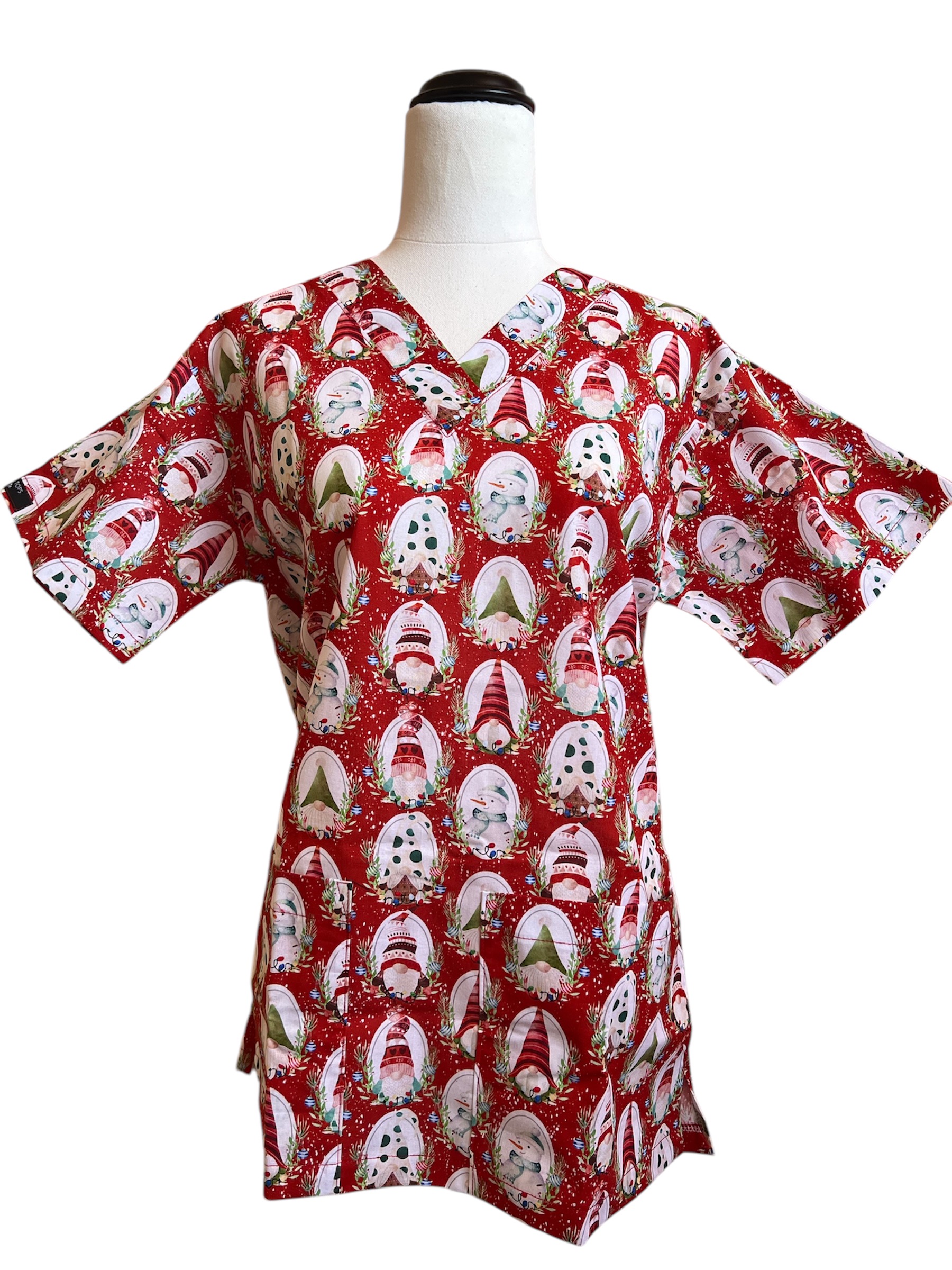 A feastive Scrubtop with various Gnomes in Holes in Red.