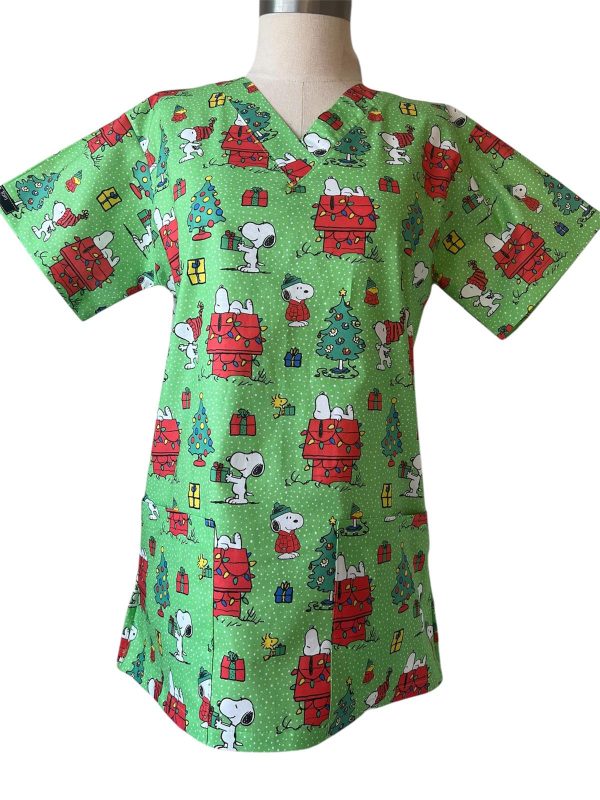 Snoopy and Woodstock from Peanuts bring the joy of Christmas in this Green Scrubtop