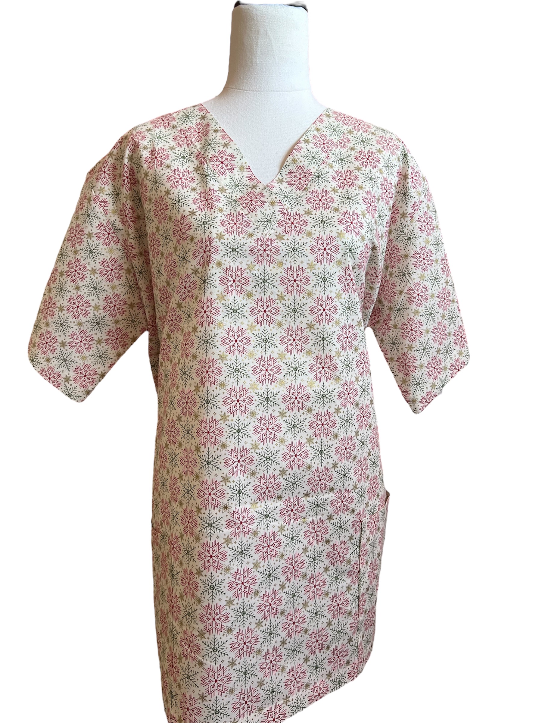 Red and Green Snowflakes on a cream Scrubtop